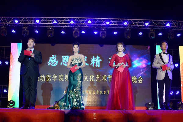 晚会分青春华章、乐道潍医、济世之梦三个篇章,百花齐放,精彩纷呈。在慷慨激昂的西洋乐器表演《聚艺青春》中晚会拉开帷幕,歌曲联唱《青春同行》、朗诵《梅兰竹菊》、诗画音《蜕变》展现了潍医学子青春飞扬、励志乐道的风采;舞蹈《紫气祥云》、《智和行韵》、器乐表演《青春奇迹》向观众们呈现出了潍医学子优美大气,温柔婉约的中国风;手语表演《繁花》赞美了潍医学子常怀济世仁心、投身医学事业的价值追求;相声表演《乐文道艺》用幽默诙谐的语言向同学们介绍本科教学工作审核评估知识,讲解如何将艺术融入校园生活;歌曲《西域之风》来自国际教育学院,展示了我校留学生风采;大学生艺术团动静脉乐队带来了歌曲《河流》,唱出了潍医学子乐道、敬业和对梦想的不懈追求,晚会在舞蹈《大话西游》中落下了帷幕。