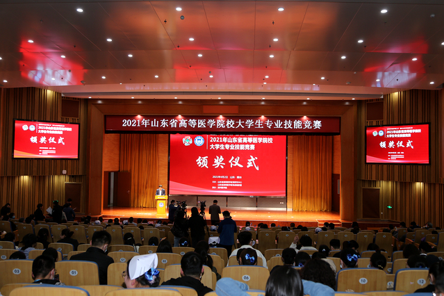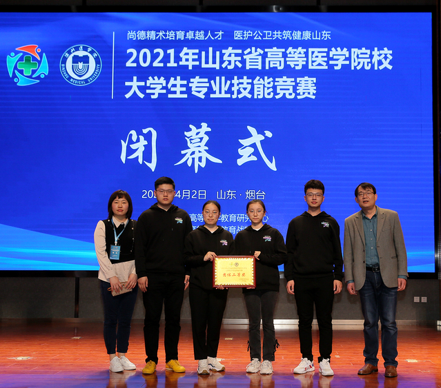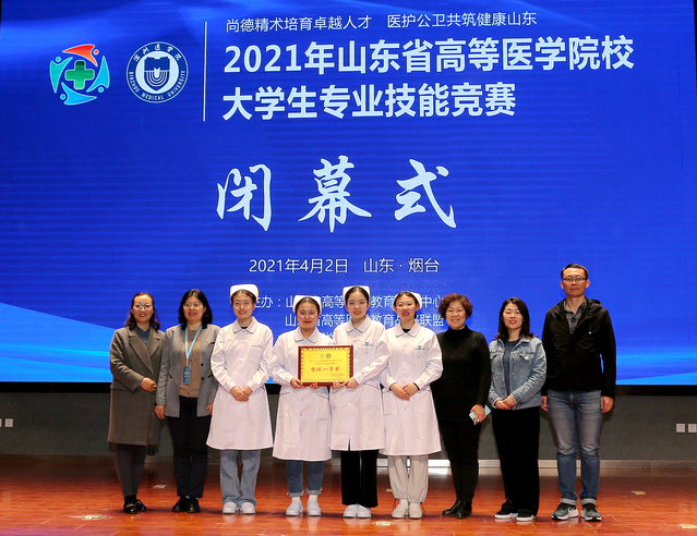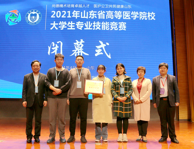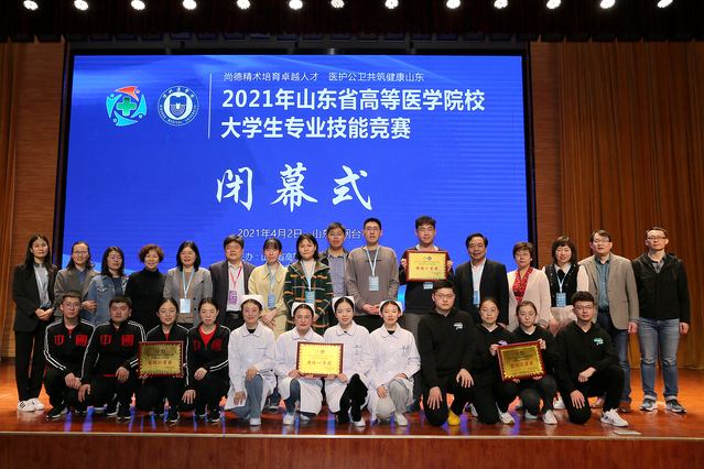 山东省高等医学院校大学生专业技能竞赛是我省医学类专业范围最广、规格最高的大学生专业技能竞赛,共有来自山东大学等8所高校的25个代表队参加角逐。我校派出临床医学、口腔医学、护理学和预防医学4个专业代表队参加竞赛,16名队员沉着应战、团结协作,凭借扎实的理论知识、熟练的技能操作以及良好的团队风貌获得评委好评,最终护理学专业和预防医学专业获得团体一等奖、临床医学专业和口腔医学专业获得团体二等奖的好成绩。临床医学专业杨素格同学获“无创呼吸机”单项奖金奖;口腔医学专业李雪松同学获“单人徒手心肺复苏”单项奖金奖;护理学专业郑甜甜同学获“外科护理学理论”单项奖金奖;预防医学专业薛鹏和徐凯同学分获“公共卫生理论知识”和“现场检测与样品采集”单项奖金奖。