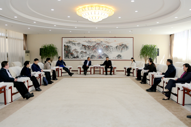 4月13日,临沂市人民医院院长李凤鸣,副院长车峰远一行6人来校交流。党委书记李明、院长管英俊、副院长刘军,党委委员、统战部部长、研究生处处长梁淑娟在办公楼五楼接待室会见了客人一行并座谈。