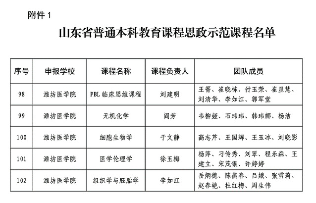 近日,山东省教育厅公示了山东本科课程思政示范项目遴选结果,我校推荐的《PBL临床思维课程》《无机化学》《细胞生物学》《医学伦理学》《组织学与胚胎学》等5门课程全部获批2021年山东省普通本科教育课程思政示范课程。