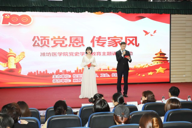 5月31日,由校党委宣传部、工会、妇委会主办,麻醉学院承办的“颂党恩 传家风”党史学习教育主题诵读活动在图书馆演播厅举行。校党委委员、宣传部部长田玉胜,各部门、学院负责人与师生代表参加活动。