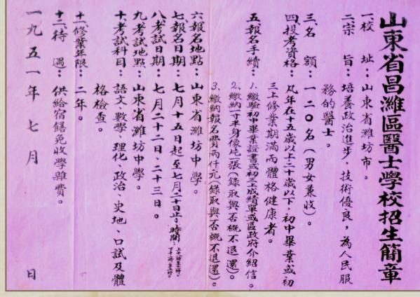 他特别回忆起那段在母校的难忘时光,“那时不像现在,建校之初,摸索办学,请医院的大夫给我们上课,所有课程都没有课本,老师讲,学生记笔记,自习时复习笔记……从1954年4月毕业,至1958年8月调离学校只要有时间,我就去昌潍人民医院内科上班,熟悉临床工作,接触病人,党的组织生活及政治运动在学校及人民医院都参加……”
