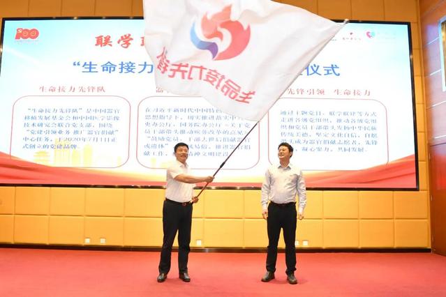 李明从黄洁夫手中接过“生命接力先锋队”党建联盟杯,从中国器官移植发展基金会和中国医学影像技术研究会联合党支部书记、中国器官移植发展基金会执行理事长赵洪涛手中接过“生命接力先锋队”队旗。院长管英俊代表学校领取了施予受器官捐献志愿服务合作单位牌匾。