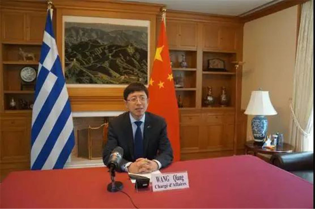 仪式上,王强代表中国驻希腊大使馆向我校和哈罗科皮奥大学表示祝贺。他表示,今年是中国共产党百年华诞,也是希腊纪念独立战争200周年,两国将共同举办中希文化和旅游年,中希关系将迎来新的发展机遇,两国教育合作大有可为。他指出,中国和希腊同为文明古国,都有尊师重教的传统。近年来,中希教育交流蓬勃发展,丰富了两国全面战略伙伴关系的内涵。当前,两国都将教育国际化作为重点方向。习近平主席强调,要坚持开放合作,加强国际交流合作,主动搭建文化友好交往的合作平台。2019年11月,习近平主席对希腊进行国事访问,签署了多项教育领域合作协议。去年,全球首家“网络中文课堂”落户希腊爱琴大学,吸引千余名希腊学生学习。两国高校间交流日益密切。潍坊医学院和哈罗科皮奥大学正式启动校际合作,这与两国政府的政策导向、与中希关系发展的大方向高度契合。王强表示,潍坊医学院和哈罗科皮奥大学都拥有着悠久的办学历史和较高科研水平,为两国培养了大量专业人才。面对新冠疫情挑战,两校创新办学思路,探索在医学、公共卫生等领域开展交流合作,这是两国教育界落实两国领导人重要共识的又一成果。希望两校以签约为契机,发挥各自优势,充分利用好“一带一路”“中国-中东欧高校联合会”等合作机制平台,进一步深化交流合作,为两国关系发展培养更多人才,为维护全球公共卫生安全,携手共建人类卫生健康共同体作出贡献。