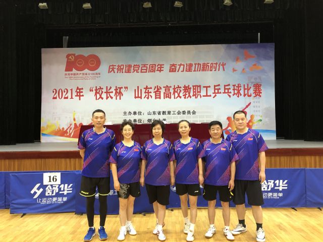 庆祝建党百周年、奋力建功新时代。7月5日-9日,由山东省教育工会主办的2021年“校长杯”山东省高校教职工乒乓球比赛在烟台大学举行,校党委副书记张潍华等六名队员代表我校参加比赛。