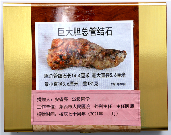 校友安省亮捐赠的巨大胆总管结石标本,胆总管结石长14.4公分,最大直径5公分,最小直径3.6公分,重181克。此例胆总管结石标本曾请我国著名肝胆外科专家王训颎建议到青岛科技情报所鉴定,得知检索近20年的中外有关文献未检测到如同此例之巨大胆总管结石。至2019年再次检索,可确认为当时世界最大胆总管结石标本。