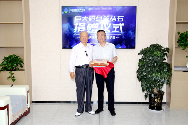 捐赠仪式上,安省亮深情回顾了在校求学的经历,表达了对学校培养的感谢之恩。他表示,在母校的求学经历,尤其是老师们求真务实地言传身教,让他一生获益匪浅,虽然离校多年,但时刻关注母校,机缘之下,在一次救治患者的手术中,获得此巨大胆总管结石。值母校七十周年校庆到来之际,特将毕生研究所著的论文著作以及积累的胆总管结石的标本群赠予母校。