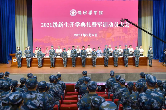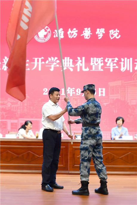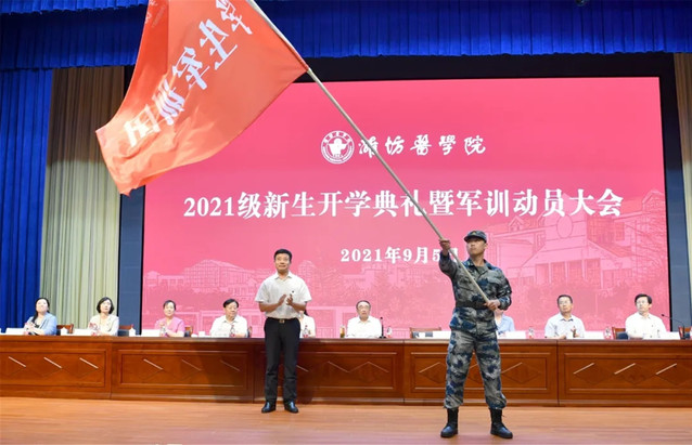 校党委书记李明为2021级军训团授旗。全体2021级新同学庄严佩戴校徽,传承“自强不息、锐意进取”的潍医精神,承载“乐道济世”的价值追求,正式加入潍医大家庭。
