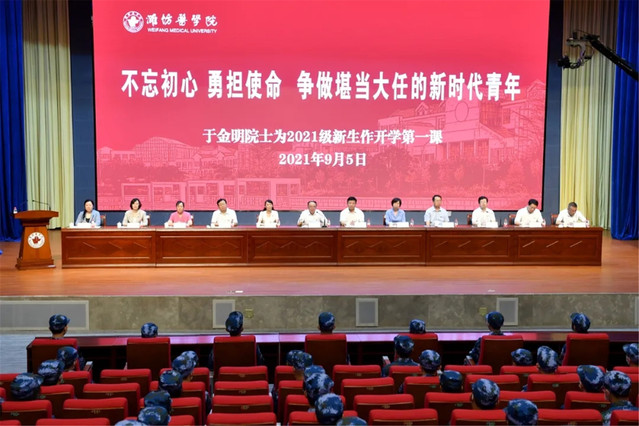 于金明院士以《不忘初心勇担使命争做堪当大任的新时代青年》为题,为新生讲授开学第一课。“42年前我进入母校学习,这使我终身受益,并对我的成长起到了非常关键的作用……”于院士回忆起在母校的学习时光和工作经历,与新同学们分享自己的座右铭“三思”,即“认真思考、科学思维和正确思想”。他建议大家多动脑、多思考,建立科学的、正确的人生观、价值观和世界观,有自己的信仰和梦想,崇尚英雄,积极发挥正能量。他动情地说,“好医生就像美丽的天使一样,具备一副矫健的翅膀,有一流的能为患者解除病痛的高超医术,更要有一流的道德情操,有全心全意为人民服务和救死扶伤的人道主义奉献精神,这就是当初我在潍医的初心。”