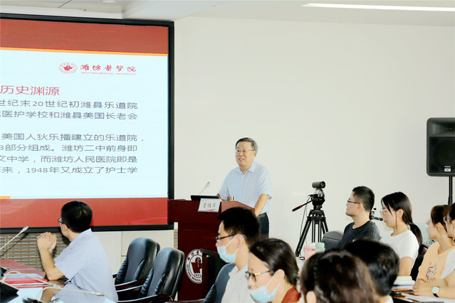 我校退休职工董铁军研究员为新职工作题为《弘扬潍医精神,做现代大学的最美奋斗者》思想政治及师德师风专题教育。董铁军从辉煌历史、奋斗历程,潍医精神、文化传承,身正为范、教书育人三个方面指导新职工牢记立德树人根本任务,树立崇高师德风范,为建设现代医科大学贡献自己的聪明才智。