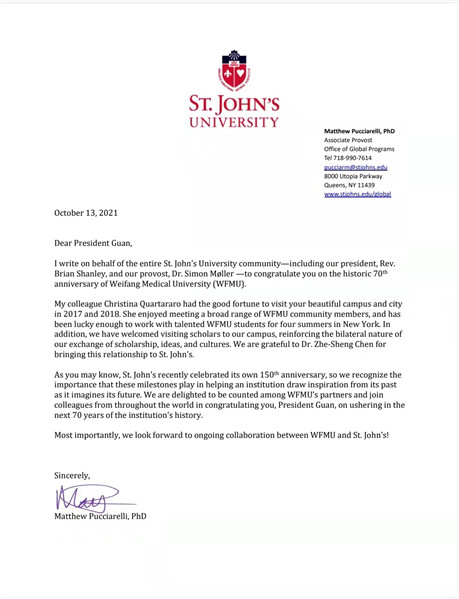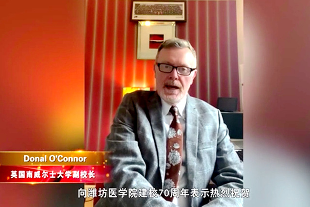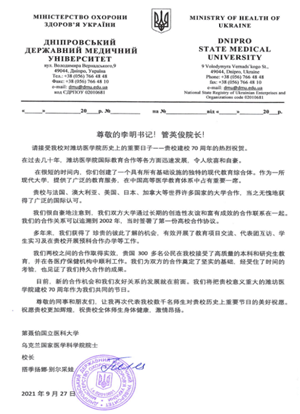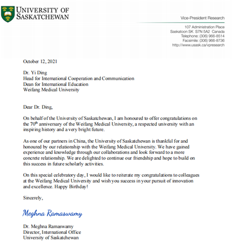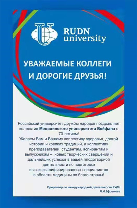 英国南威尔士大学、希腊哈罗科皮奥大学、加拿大萨斯喀彻温大学、乌克兰第聂伯国立医科大学、美国圣约翰大学、奥地利维也纳应用科技大学、英国莱斯特大学、俄罗斯人民友谊大学等10余所海外友好学校以视频、正式来函、电子邮件等形式,向我校发来祝福,对学校70周年校庆表示热烈祝贺和真诚祝愿。