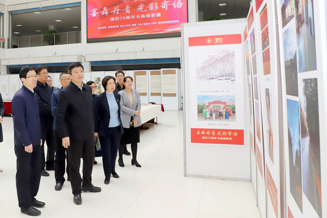 观展过程中,李明充分肯定了在校庆期间举办“墨舞丹青 光影寄语”书画摄影展的重要意义。他指出,七十年校庆既是对学校发展历程的总结回顾,也是凝心聚力再谱新篇的重要节点,同时也是校友、师生表达爱校荣校情怀的重要庆典。本次书画摄影展活动,主题鲜明、内涵丰富、形式多样,是对我校长期致力于校园文化建设、深耕传统文化传承创新成果的集中展示,是丰富师生精神文化生活、提升校园文化氛围的有力实践,也是校友、师生和离退休老同志心系学校、奋发有为精神风貌的生动诠释,更为校庆70周年增添了浓墨重彩的一笔。
