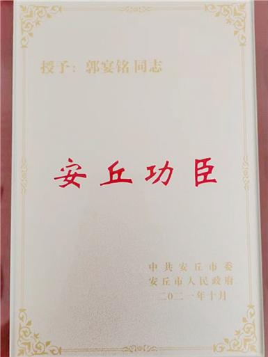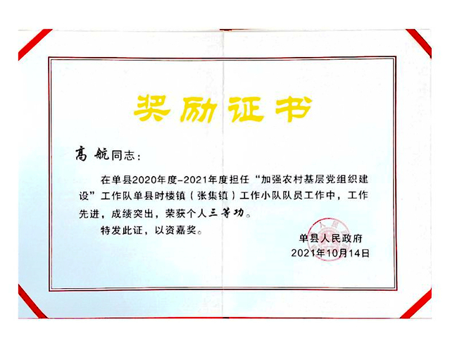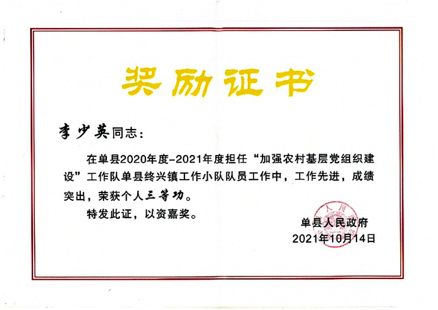 近日,我校第一批山东省“加强农村基层党组织建设”工作队李少英、郭宴铭、高航三名同志完成省委选派任务,其中郭宴铭同志被安丘市人民政府授予“安丘功臣”称号,李少英、高航分别被单县人民政府记“个人三等功”一次。
