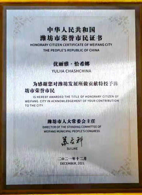 2021年12月31日,潍坊市第十七届人民代表大会常务委员会第四十九次会议决定,授予我校国外合作高校友人优丽雅·恰希娜等8人为“潍坊市荣誉市民”称号。