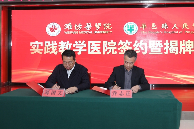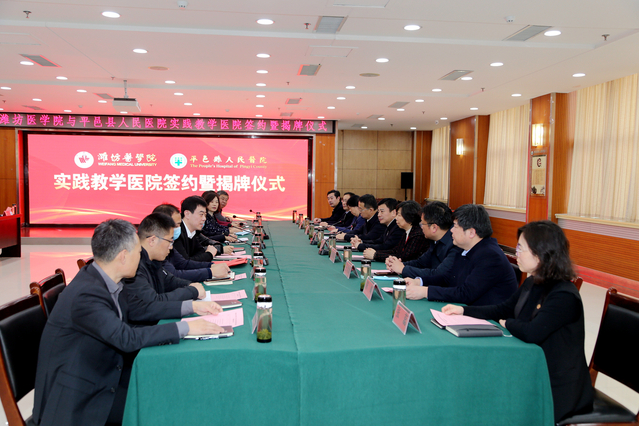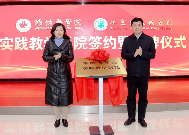 1月6日,潍坊医学院—平邑县人民医院实践教学医院签约揭牌仪式在平邑县人民医院举行。校党委书记李明与平邑县县委书记张晓彬共同为“潍坊医学院实践教学医院”揭牌。校党委副书记张潍华、副院长葛国文,临沂市卫生健康委二级调研员杨斌,平邑县县委副书记任大鹏,县卫生健康局局长华明秀,县人民医院党委书记杨志国、院长乔志正等出席仪式。平邑县副县长张晓华主持活动。