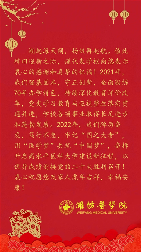 农历腊月二十九,学校党委书记李明、院长管英俊还为全体医护教职员工发送了拜年短信,衷心祝愿大家虎年吉祥,幸福安康!