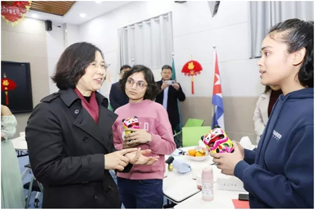 在看望假期留校学生的时候,校领导参加了留学生的新年联欢会,为他们送上了中国年味十足的民俗产品“泥老虎”,告诉他们“虎”与“福”谐音,是中国民间祈福的吉祥之物,预示着一年的好光景,祝福大家虎年虎虎生威、平安幸福。泥老虎造型威武、色彩鲜艳,尤其受到留学生的喜爱。