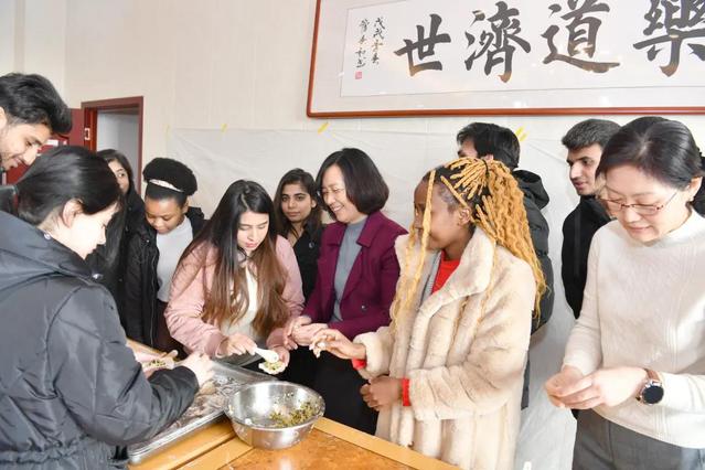 过年包饺子是重要的中华传统习俗,让国际学生亲自动手体验和面、揉面、擀皮儿、包馅儿,再到下锅、煮熟的制作流程,更能让他们深刻的理解“饺子”这一中华文化元素所传递的内涵与意义,更岁交子,寓意喜庆团圆,吉祥如意。1月21日上午,“包迎春饺,解思乡情”中国传统文化体验活动在杏林餐厅举办,副院长卢国华出席活动。活动中,师生分组开工,每组由一名工作人员担任“教师”现场教学。卢国华也加入到包饺子队伍中,手把手教给大家包饺子的技巧。看着饺子皮和饺子馅在老师手中很快变成了饱满又好看的饺子,同学们也像模像样地包了起来,擀皮、包馅、对折,一个个各具异国特色的饺子摆满了托盘,大家纷纷拍照留念,记录这欢快又难忘的时刻。