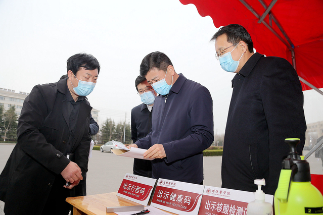 3月16日和17日,校领导对南大门、学生宿舍区、学校防疫物资储备、安全生产等重点区域、关键部位进行了现场详细检查。校党委书记李明强调:一要在思想上高度重视。校门是学校疫情防控的“第一关”,要时刻绷紧疫情防控安全弦,严格按照上级要求和学校疫情防控方案,加强对校门口进出人员的管控,严格规范登记、测温、绿码、行程码、核酸检测等工作程序。二要压实压细工作责任。以“严真细实快”的工作作风,狠抓疫情防控工作落地落实,确保防疫物资保障到位,统筹做好疫情防控和教育教学及日常管理工作。三要全面细致服务师生。积极担当作为,以实际行动为师生办实事,关心关爱师生身心健康,为全校师生提供安全、放心的校园环境,保障教学、生活安全有序。