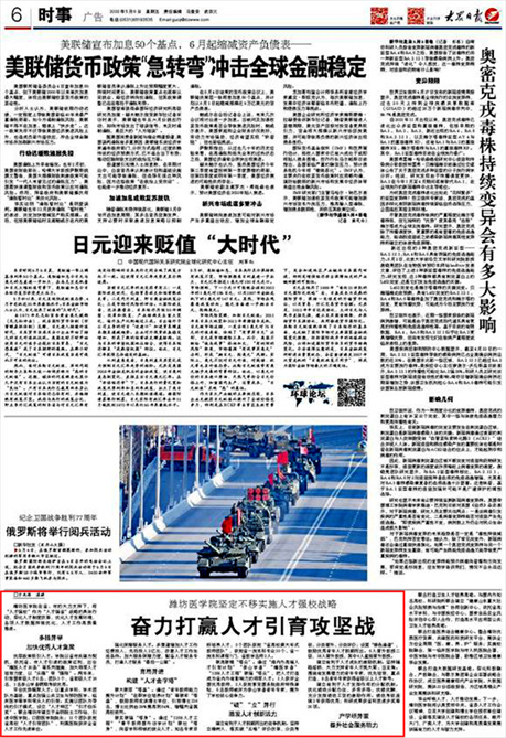 5月6日,大众日报第六版以“潍坊医学院坚定不移实施人才强校战略 奋力打赢人才引育攻坚战”为题刊发新闻通讯,报道我校人才引育工作高质量推进情况。