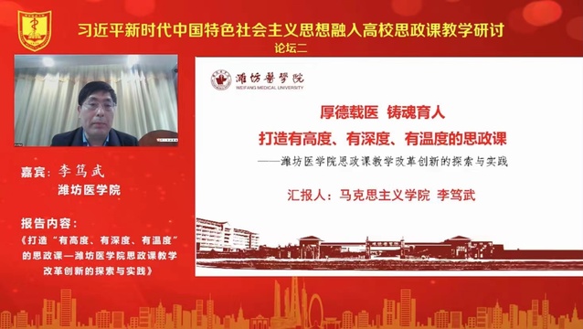 全国独立设置医学院校马克思主义学院联盟,是整合成员单位力量,推动资源共享、经验交流、综合发展、打造特色的工作平台,是全国独立设置医学院校开放共享发展的有益尝试。联盟成立大会之后,“习近平总书记关于卫生健康的重要论述研究”和“习近平新时代中国特色社会主义思想融入高校思政课教学”两个分论坛同时开讲,来自全国医学院校的18位学者分享了各自的研究成果,作了精彩的学术报告。我校马克思主义学院院长李笃武作了《打造“有高度、有深度、有温度”的思政课—潍坊医学院思政课教学改革创新的探索与实践》的主题报告,围绕如何打造“有高度、有深度、有温度”的思政课,结合学院近年来的思政育人实践,分享了我校思政课教育教学的改革初衷、创新理念、特色做法等,内容丰富、深入浅出,引发了大会的高度关注。
