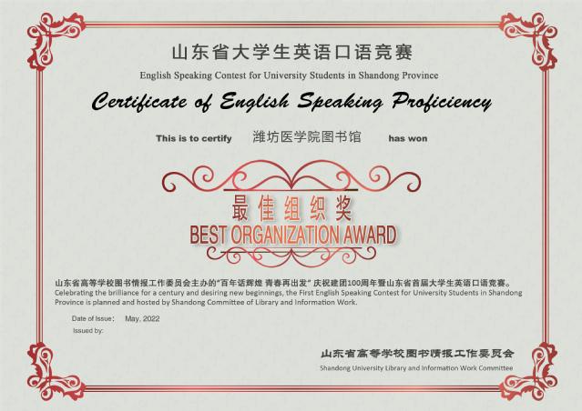 此次大赛由我校图书馆、团委、外国语学院联合组织参赛,不仅锻炼提升了我校大学生的英语口语表达能力和语言运用能力,也充分展现了潍医学子蓬勃向上的精神风貌,有效丰富了同学们的学习生活。