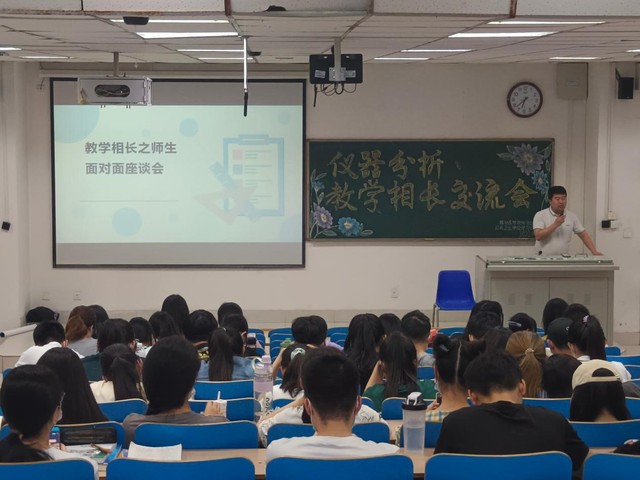 交流会上,周进老师阐释了《仪器分析》这门课程的学科概念与学习方法。他指出该门课程的学习要透过现象看本质,掌握仪器性质,做到化繁为简;要合理规划学习时间,摸索科学的学习方法,将知识融会贯通。会后,他还对同学们提出的问题进行答疑解惑,现场气氛积极热烈。