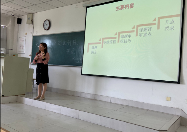 胡善菊老师首先向同学们介绍了2022年度国家级、省级、校级大学生创新创业训练计划项目的基本情况、参赛流程、注意事项。然后结合自己的指导经验,向同学们介绍了大创项目的申报流程、申报技巧、评审要点、注意事项,重点强调了团队合作、选题、研究内容、技术路线的重要性。胡善菊老师特别指出,大创计划的申报考验项目主持人对全局的掌控力和责任感,要求项目负责人要具有较高的责任意识和担当能力,在项目进行中应该及时与指导老师进行沟通与交流,及时发现问题、解决问题,提高申报效率。最后,胡善菊老师向与会师生展示了往届的优秀标书,号召同学们向优秀学长学姐们学习,积极参加各级各类大学生创新创业活动,积极通过课题申报、课题研究、团队合作锻炼自己、提升自己。