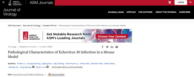 近日,国际病毒学领域权威期刊《Journal of Virology》在线发表了我校基础医学院与中国疾病预防控制中心病毒病预防控制所合作最新研究成果“埃可病毒30型感染乳鼠模型的病理特征”(Pathological characteristics of echovirus 30 infection in a mouse model),我校硕士研究生李冀琛同学为本文第一作者,中国疾控中心张勇教授和我院刘志军教授为共同通讯作者。该研究首次建立了埃可病毒30型感染小鼠的动物模型。