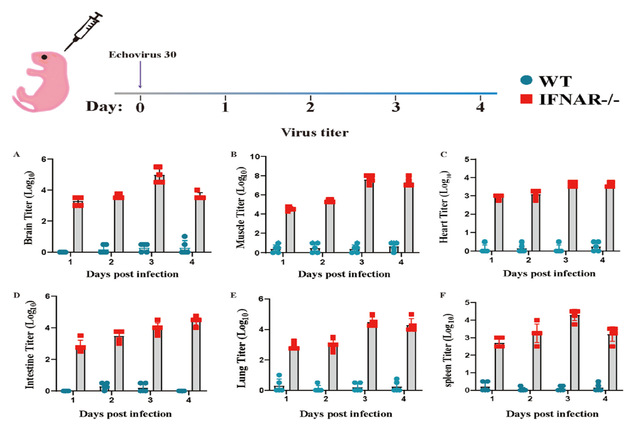 埃可病毒30型(Echovirus 30, E30)为人源性肠道病毒B家族的重要成员,是引起人病毒性脑炎和脑膜炎最主要的病原体之一。由于缺乏合适的动物模型,E30的发病机制仍知之甚少。联合课题组通过建立小鼠感染模型研究E30的致病性。2日龄IFNAR-/-乳鼠被E30(WZ16病毒株)感染后,表现出嗜睡、瘫痪甚至死亡。病理学检测发现E30感染引起骨骼肌、脑等部位不同程度的组织损伤,骨骼肌中病毒含量最高。转录组学测序及qPCR验证实验均表明,E30病毒感染小鼠脑组织和骨骼肌组织后引起显著的差异基因表达,并成功筛选出9个与补体反应和神经病变相关的差异基因。研究者发现在小鼠脑区可检测到病毒基因,同时成功确定了E30在U251细胞上的复制活性。以上结果表明E30感染可影响神经系统,这为将来进一步深入探讨E30发病机制提供了理论基础。