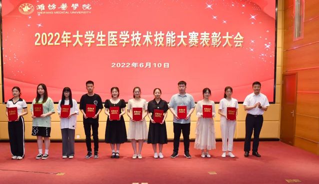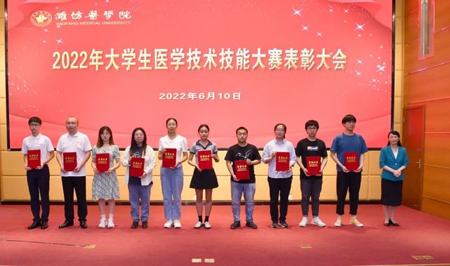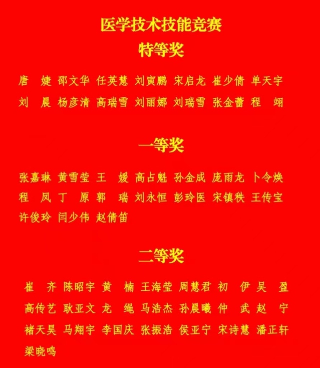 临床医学院、公共卫生学院、护理学院、口腔医学院、药学院、麻醉学院、医学影像学院分别获得“医学技术技能培训优秀组织单位”荣誉称号,王飞等44名老师获得“医学技术技能培训优秀指导教师”荣誉称号,唐婕等14名同学获得“医学技术技能竞赛”特等奖,张嘉琳等17名同学获得“医学技术技能竞赛”一等奖,崔齐等22名同学获得“医学技术技能竞赛”二等奖。