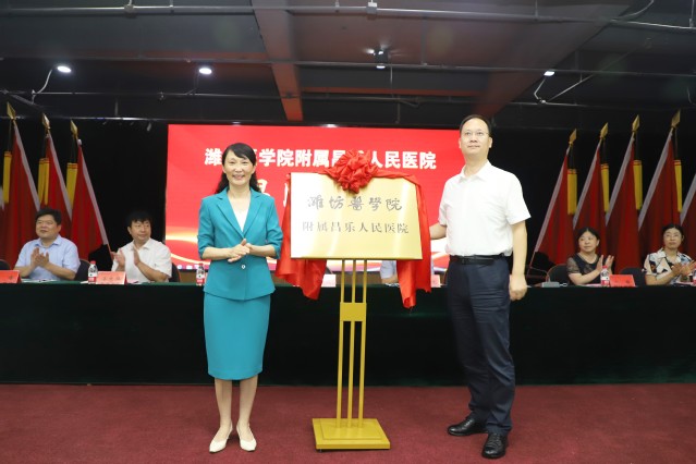 管英俊与桑海强共同为“潍坊医学院附属昌乐人民医院”揭牌。