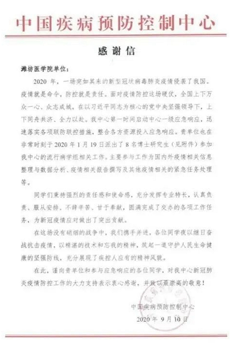 2020年9月,中国疾控中心的感谢信为潍医学子点赞
