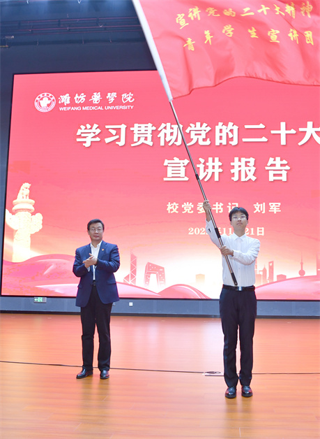 宣讲会上,举行了学习贯彻党的二十大精神青年学生宣讲团授旗仪式,刘军为学校青年学生宣讲团授旗。