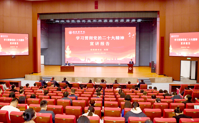 刘军紧扣党的二十大报告原文,围绕大会主题、重要成果、精神实质和战略部署等方面,紧密结合学校教育改革发展实际,从“对党的二十大精神的认识和体会”“以党的二十大精神为指引开启新征程、谱写新篇章”“在新征程上开创工作新局面、展现潍医新担当”三个方面,进行了全面深入的宣讲。
