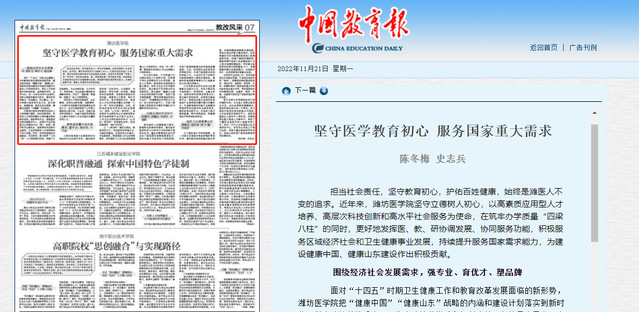 1121日,中国教育报以《坚守医学教育初心  服务国家重大需求》为题,报道我校高素质应用型医学人才培养,助力地区发展情况。