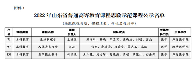近日,山东省教育厅公布省级课程思政示范项目遴选结果,我校《基础护理学》《人体寄生虫学》《医学微生物学》3门课程获批2022年山东省普通本科教育课程思政示范课程。
