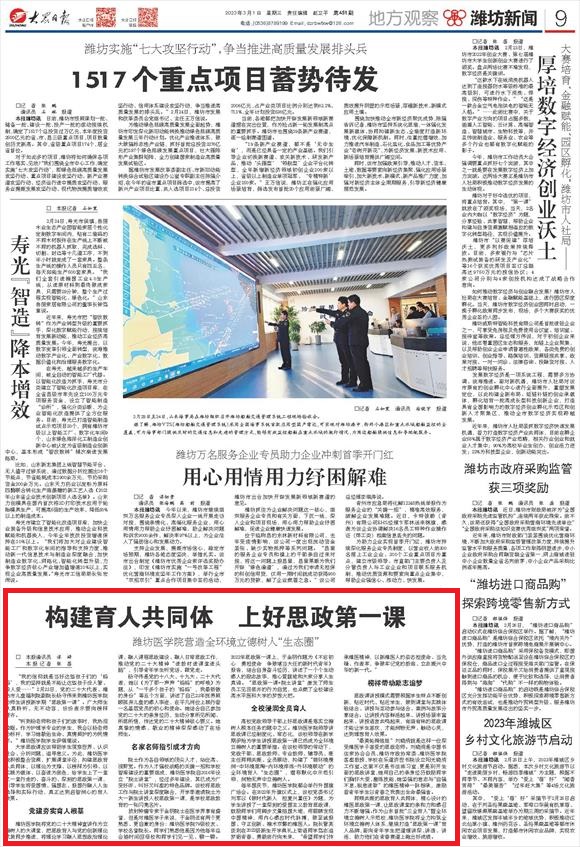 3月1日,《大众日报》以《构建育人共同体 上好思政第一课---潍坊医学院营造全环境立德树人“生态圈”》为题报道学校开学思政第一课育人典型做法。