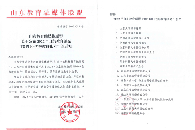 日前,山东教育融媒体联盟公布2022年度山东教育融媒TOP100优秀教育账号,我校官方微信入选。