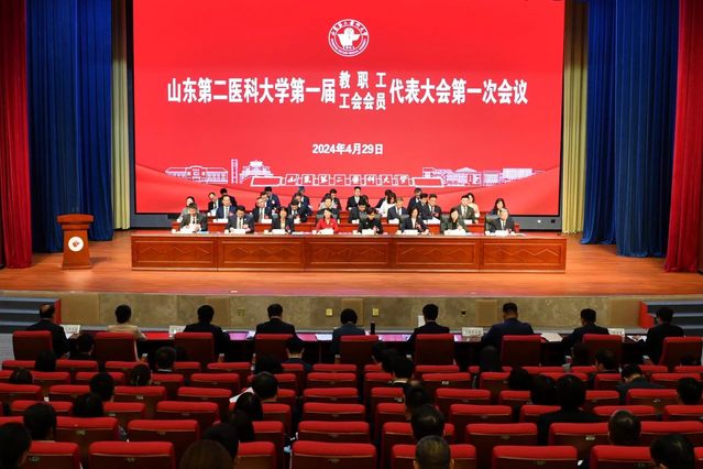 4月29日,山东第二医科大学第一届教职工代表大会 工会会员代表大会第一次会议隆重召开。省教育工会委员会主席王贞应邀到会祝贺。学校党政领导班子成员管英俊、卢国华、王承高、梁淑娟、孔令军、田玉胜、王世群、刘汉波,潍坊市总工会党组书记、常务副主席贾平及潍坊学院工会主席张华,以及大会主席团其他成员和特邀代表在主席台就座。