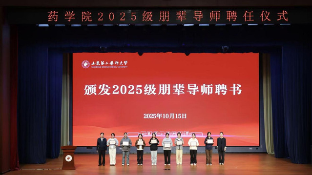10月15日,药学院举行2025级朋辈导师聘任仪式。药学院党委书记刘宪亮、副书记徐帆、全体辅导员、新聘朋辈导师代表及2025级全体新生参加。
