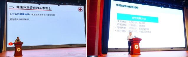 讲座中,公共卫生学院副教授王霞以《健康体重管理的基本理念、居民膳食宝塔、大学生健康食谱:要瘦要美要健康》为题,解读健康体重定义与膳食宝塔,针对大学生饮食误区给出健康食谱,引导树立科学饮食意识;后勤管理处副处长高凯围绕《科学健身的方法、原则和技巧》,从久坐危害切入,讲解科学健身原则,推荐适合大学生的简易健身项目,并现场示范拉伸动作。同时引导师生摒弃极端减重观念,树立科学饮食意识和规范良好的锻炼理念,其生动易懂的讲解赢得现场阵阵掌声。