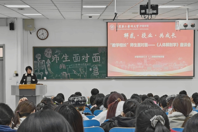 为切实解决学生学习难题,助力学业进步与成长成才,护理学院于近日举办“教学相长”师生面对面之《人体解剖学》座谈会。本次活动特邀人体解剖学教研室主任于树娜、韦春莲博士担任主讲,辅导员及2025级全体学生参加。