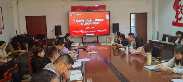 11月13日下午,外国语学院举办“以文化人 共享共促”第九期教学沙龙活动。学院全体教师参与,共同围绕教学前沿动态、学科发展方向展开交流探讨,现场学习氛围浓厚。