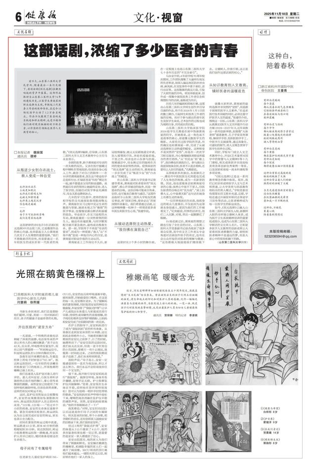 11月18日,《健康报》文化·视窗版面在头条以“这部话剧,浓缩了多少医者的青春”为题,深度报道了我校原创话剧《别无选择》的创作历程、演出反响及育人成效。报道全面介绍了该剧以建校74年来的奋斗历程为背景,聚焦青年医学生的成长轨迹,通过三代医务工作者的使命传承,生动诠释了“国家召唤,使命必达”的家国情怀与医者担当。