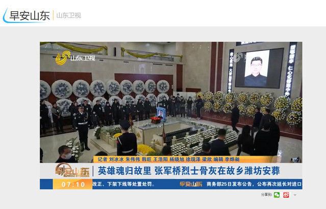 山东广播电视台发布视频:“英雄魂归故里 张军桥烈士骨灰在故乡潍坊安葬。”
