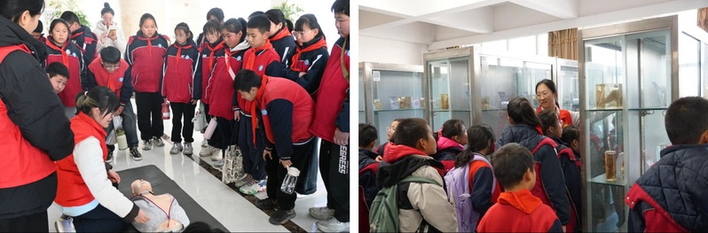 活动在欢腾喜庆的舞狮表演中拉开帷幕。在生命科学馆,专业讲解员借助真实的人体标本与精细模型,结合生动易懂的解说,将抽象的人体结构知识转化为直观的视觉体验,引导孩子们在观察与思考中理解生命的构造与奥秘;在临床技能中心,学生志愿者手把手指导孩子们学习心肺复苏和海姆立克急救法等急救技能,传递张军桥先进事迹精神;步入中国精神长廊,一幕幕波澜壮阔的中国发展历程、一段段感人至深的医学前辈事迹,让孩子们感悟到家国情怀与医者仁心的深刻内涵;校园漫步时,志愿者们带领师生参观校园景观与教学设施,使孩子们沉浸式感受大学浓厚的学术氛围与人文底蕴,进一步点燃他们的求学热情与梦想。