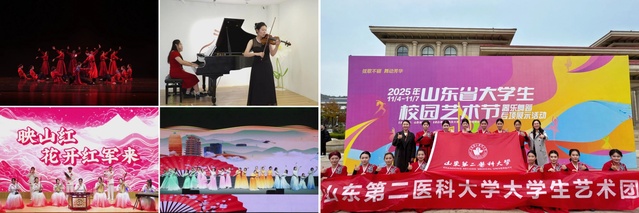 近日,在2025年山东省大学生校园艺术节器乐舞蹈专项展示活动中,由我校大学生艺术团器乐队、舞蹈队演绎的4项作品全部获奖,斩获一等奖1项,二等奖2项,三等奖1项。我校荣获优秀组织奖,是省内唯一荣获优秀组织奖的高等医学类院校。