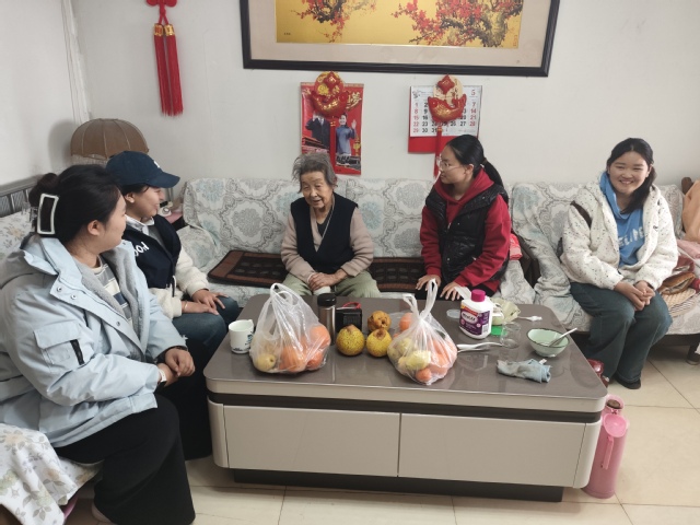活动中,志愿者们与老人们围坐畅谈,认真聆听老党员讲述峥嵘岁月里的奋斗故事与入党初心。朴实的话语、鲜活的经历,让志愿者们深刻感悟红色精神的时代内涵,接受了一场生动的红色教育。随后,大家携手唱响经典歌曲,悠扬的旋律回荡在社区,欢声笑语拉近了青春与银发的距离,现场暖意融融。活动尾声,志愿者们带着诚挚的祝福,上门拜访了社区90多岁高龄老人,与老人亲切交谈,询问身体和生活情况,为高龄老人送去陪伴与关怀。
