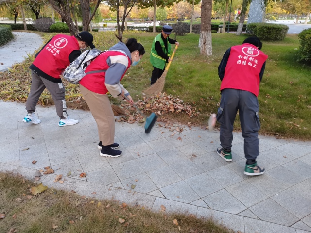 志愿者分为三组,依次开展大讲堂、自习室的卫生清扫以及杏林路的自行车辆整理摆放工作。志愿者们主动帮助环卫工人做好清扫保洁工作,对道路内绿化带、卫生死角、落叶垃圾进行清理。在清理的同时,志愿者们还向周边的同学开展文明校园的宣讲,劝导大家爱护环境卫生,改变乱扔垃圾的陋习,鼓励同学们相互监督,共同维护,以良好的环境助推文明校园建设等各项工作。在志愿者们的带动下,其他同学也纷纷参与到志愿活动中。